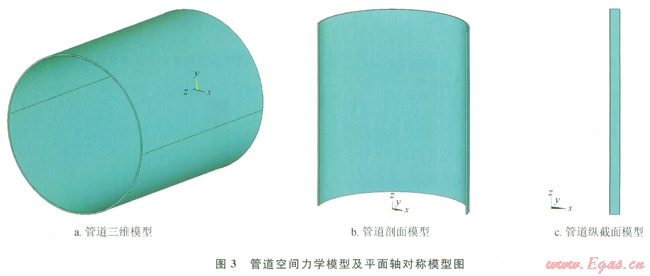 根據(jù)彈性力學(xué)和有限元理論,管道熱應(yīng)力和外擠載荷的空間問題可以應(yīng)用平面應(yīng)力及軸對稱建立平面有限元模型,計(jì)算分析管道的應(yīng)力分布及大小如圖3所不。圖3-a為1219mm外徑X80管道空間力學(xué)模型;圖3-b為X80管道三維剖面,以2軸為對稱軸;圖3-c為管道縱軸旋轉(zhuǎn)截面,以z軸為對稱軸旋轉(zhuǎn)。