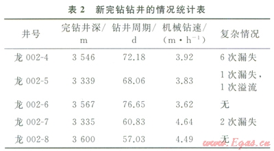 2010年下半年新鉆的以珍珠沖組和須家河組為目的層的中深井,包括龍002-4、龍002-5、龍002-6、龍002-7、龍002-8井等井,實鉆基本采納了建議的鉆井井身結(jié)構(gòu)和鉆井液密度安全窗口,中間技術(shù)套管下至坍塌壓力逐步抬升之前的沙溪廟組中下部,下部作為單獨一開井眼;另外除龍002-6井外,各井鉆井方向選擇有利本區(qū)井壁穩(wěn)定性的方向(即75°~l65°或255°~345°);結(jié)合利用新技術(shù)(空氣鉆井、欠平衡鉆井、優(yōu)選鉆頭)鉆井效率得到明顯提高,基本沒有出現(xiàn)阻卡現(xiàn)象,僅偶爾出現(xiàn)幾次漏失或溢流情況,鉆井事故、復(fù)雜大大降低,如表2所示。其中龍002-4井刷新九龍山第四次開鉆的疹152.4mm井眼定向井最短鉆井周期(原紀(jì)錄為l02d)和最高機械鉆速(原紀(jì)錄為2.79m/h)兩項紀(jì)錄;龍002-8井完鉆周期只有57.03d,刷新了九龍山四開以須二段為目的層的直井最短周期記錄。地應(yīng)力分析技術(shù)(GMI)在九龍山新鉆井中取得很好的應(yīng)用效果。