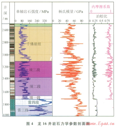 GMI地應(yīng)力模型提供了三軸主地應(yīng)力(上覆地層壓力、最小水平主應(yīng)力、最大水平主應(yīng)力)的大小和方向、地層孔隙壓力、巖石機械力學(xué)性質(zhì)(單軸巖石強度、楊氏模量、內(nèi)摩擦系數(shù)、泊松比)等4項參數(shù)的計算和描述。特殊地區(qū)還需考慮薄弱地層(特殊地層如鹽層)、原生斷層、裂縫的分布、地?zé)嵋蛩赜绊懙?。我們根?jù)九龍山構(gòu)造的鉆井、地質(zhì)、測井(包括成像測井)、測試等資料,以龍l6井為例建立了九龍山構(gòu)造的地應(yīng)力模型,基本摸清了本區(qū)的現(xiàn)今地應(yīng)力狀態(tài)。