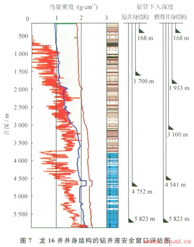 根據(jù)九龍山構(gòu)造地應(yīng)力模型和三個地層壓力剖面,對已鉆的龍16井和龍17井的井身結(jié)構(gòu)和鉆井液密度安全窗口進行了風(fēng)險評估(圖7)。從維持井壁穩(wěn)定性角度考慮,分析其井身結(jié)構(gòu)和鉆井液密度安全窗口存在較大的缺陷,致使中間技術(shù)套管段無可操作的鉆井液密度安全窗口,井壁穩(wěn)定性變差,這可能是兩井在該段頻繁出現(xiàn)遇阻、卡鉆甚至鉆井事故的力學(xué)根源;同時海相地層的鉆井液密度安全窗口也非常窄,極易誘發(fā)井漏、井涌溢流復(fù)雜。