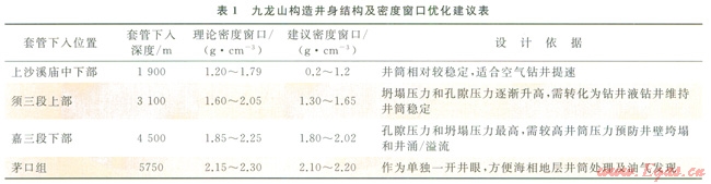 以孔隙壓力與坍塌壓力二者的最大值作為優(yōu)化鉆井液密度安全窗口下限,取地層破裂壓力作為七限的原則。本區(qū)超深井應(yīng)采取五層套管,除表層套管外,各層套管下深及鉆井液密度窗口(圖7和表l)。對于中深井,只需去掉下部一層或兩層套管,可使各井眼段均有安全的鉆井液密度窗口,能有效維持井壁的穩(wěn)定性。但如地層裂縫發(fā)育,應(yīng)及時采取措施提高地層承壓能力,防范井漏發(fā)生的風(fēng)險。