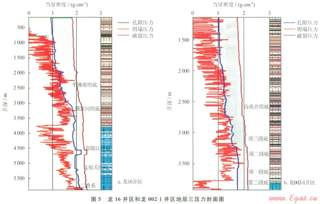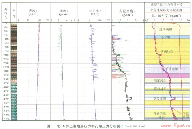 龍16井陸相地層的聲波、密度和電阻率3條曲線從中侏羅統(tǒng)沙溪廟組下部開始出現(xiàn)明顯偏離泥巖正常壓實趨勢[5](圖1)。因此判斷地層孔隙壓力白沙溪廟下部逐漸升高,部分井上三疊統(tǒng)須家河組的地層壓力系數(shù)高達l.83,本區(qū)實測壓力數(shù)據(jù)、鉆井液氣侵等現(xiàn)象也說明了須家河組具有較高的壓力異常。海相地層孔隙壓力形成機理和預(yù)測方法比較復(fù)雜,通過各井鉆井液密度、漏失和氣浸溢流等現(xiàn)象分析,認為部分井段碳酸鹽地層壓力系數(shù)最高至2.15(如下三疊統(tǒng)嘉陵江組嘉二段高壓鹽水層)。
