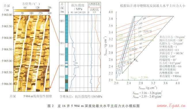 最大水平主應(yīng)力大小的定量確定比較困難,這是地應(yīng)力研究和應(yīng)用的一大難題。根據(jù)本區(qū)成像測井分析了各井在鉆井液液柱壓力下的井壁破壞類型及程度,利用地應(yīng)力分析模塊(GMI*SFIB),反演模擬小同深度處最大水平主應(yīng)力(SHmax)的大小。圖2顯示龍16井5904m深度處發(fā)育一條張裂縫,巖性為含膏灰?guī)r,巖石抗壓強度約l30MPa,上覆地層壓力當(dāng)量密度2.60g/cm3,最小水平主應(yīng)力當(dāng)量密度約2.30g/cm3,鉆井液密度(2.23~2.283/cm3)與孔隙壓力當(dāng)量密度之差為0.173/cm3,選取Mohr-Colum巖石破壞準(zhǔn)則,反演模擬其最大水平主應(yīng)力當(dāng)量密度為3.15~3.263/cm3。