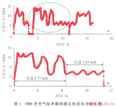 大出水地層接立柱時(shí),由于停止注氣井底大量積液,造成環(huán)空當(dāng)量密度升高,降低了氣體鉆井機(jī)械鉆速;同時(shí)注氣舉液壓力高、波動(dòng)大、時(shí)間長(zhǎng),給地面設(shè)備及管線(xiàn)帶來(lái)較大的安全風(fēng)險(xiǎn)。DB6井氣體鉆井期間地層出水量約74m3/h,鉆完1柱立柱大約需6h,而接立柱后注氣舉液至壓力穩(wěn)定約需4h,最高壓力14MPa(圖1-a),井底壓力穩(wěn)定前后鉆速相差1倍(圖1-b)。