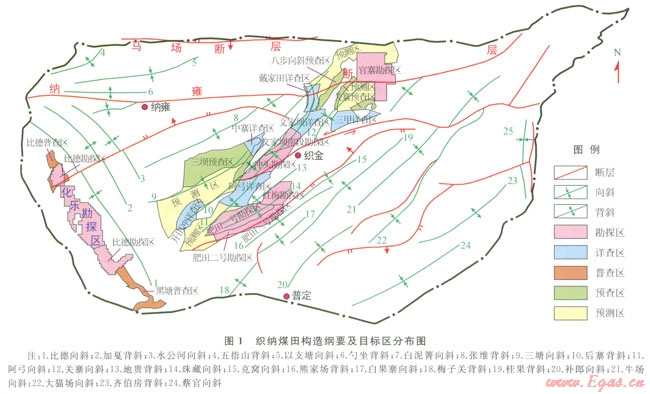 織納煤田位于貴州省中西部,主要包括比德向斜、三塘向斜、阿弓向斜、珠藏向斜、關寨向斜5個向斜單元,含煤面積約為l016.3km2,區(qū)內煤田地質工作程度高,除煤炭預測及預查區(qū)外,煤炭勘查面積達695.64km2,煤炭總資源量為90.33×108t;據貴州省煤田地質局l996年提交的“貴州省煤層氣資源評價報告”[1],織納煤田煤層氣資源量為7611×108m3,但該區(qū)煤層氣的系統(tǒng)評價還很薄弱。因此,對煤出煤層氣資源狀況、賦存條件進行全面分析和評價,優(yōu)選煤層氣重點勘查和開發(fā)區(qū)塊很有必要[2-4]。