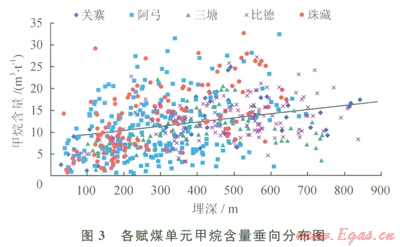 全區(qū)含氣量為0.48~32.69m3/t,平均為ll.90m3/t,各向斜以東部的關寨向斜最高,平均含量為15.47m3/t,比德向斜和珠藏向斜次之,平均含量分別為12.94、12.54m3/t,阿弓向斜最低,平均含量為10.15m3/t;氮氣含量不高,一般小于2m3/t;蕈烴平均含量0.75m3/t;全區(qū)甲烷含量以肥田二號最高,平均為l6.90m3/t。評價區(qū)總體顯示甲烷含量隨埋深的增加而增加,趨勢較為明顯,表明埋深對煤層氣含氣性具有重要的控制作用(圖3)。
