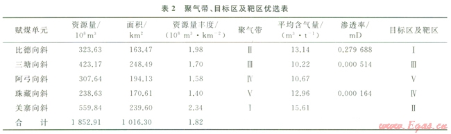 煤層氣勘探目標區(qū)應是蘊藏有一定資源量、并具有煤層氣富集高產潛勢的地區(qū)。因此,煤儲層含氣量和滲透率是應優(yōu)先考慮的兩個關鍵控氣因素,面積和資源豐度(兩者之積為煤層氣資源量)對目標區(qū)的經濟價值也具有決定性意義。按照遞階優(yōu)選法,按聚氣帶®目標區(qū)®靶區(qū)的遞階層次進行選區(qū)評價和優(yōu)選,優(yōu)選的關鍵主要在于煤儲層面積、含氣量、儲層滲透率和臨儲壓力比5個要素[7,19-21]。