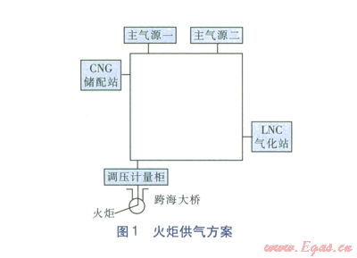 海陽市地處黃海之濱、山東半島的中南部、膠東半島南翼,南臨黃海,北接半島內(nèi)陸,位于煙臺、青島、威海三個開放窗口城市中心地帶,有“東方夏威夷”的美譽,2012年第三屆亞洲沙灘運動會(以下簡稱亞沙會)便在海陽市旅游度假區(qū)舉行。該地區(qū)天然氣的開發(fā)和經(jīng)營權(quán)屬我公司,給亞沙會火炬供氣即成為必然。根據(jù)公司管網(wǎng)現(xiàn)狀、氣源情況、火炬臺現(xiàn)場及亞沙會火炬設(shè)計方所提供的技術(shù)參數(shù)及其他綜合因素,提出火炬供氣方案,見圖l。