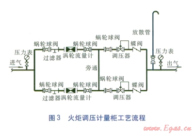 調(diào)壓計量柜內(nèi)安裝兩路調(diào)壓計量裝置,在兩路并聯(lián)的前提下增加旁通管將兩路裝置連接?;鹁嬲{(diào)壓計量柜工藝流程見圖3。燃氣計量設(shè)施安裝于調(diào)壓器之前,一路采用工況(298.15K,0.26MPa)流量為l000m3/h的渦輪流量計;另一路計量采用工況(298.15K,0.26MPa)流量為650m3/h渦輪流量計:調(diào)壓器最大流量>4500m3/h。