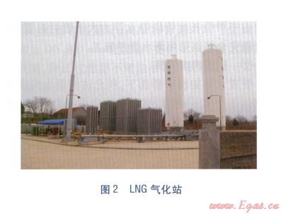 在長輸管道通氣之前,LNG氣化站一直是海陽旅游度假區(qū)的主要氣源。該氣化站是我公司于2005年作為海陽市招商引資項目投資建設(shè)的(見圖2)。主要設(shè)備有兩臺l00m3立式LNG儲罐,一臺2000m3/h空溫式氣化器,一臺2000m3/h水浴式氣化器,一臺200m3/h卸車增壓器,一臺400m3/h的BOG增壓器。日供氣量約10×104m3/d。將LNG氣化站作為氣源三,其出口壓力為0.27MPa,出口管道規(guī)格為SDRll PE80 NOD 250mm,距離火炬調(diào)壓計量柜約7km,與主氣源一、二配合完全可以滿足火炬高峰用氣量。