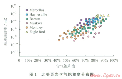 美國是頁巖氣開發(fā)利用最成功的國家,全美頁巖氣技術可采資源量為24.4×1012m3,投入商業(yè)開發(fā)的主要為海相頁巖,有Barnett、Marcellus、Antrim、Fayetteville、Woodford和Haynesville頁巖等[5]。2005年以來,隨著以水平井分段壓裂為代表的關鍵技術的突破,促進了美國頁巖氣產業(yè)的快速發(fā)展。據美國能源信息署預測,2015年美國頁巖氣產量將達到2600×108~2800×108m3,約占天然氣總產量的l/3[6-7]。北美地區(qū)凡是商業(yè)化的頁巖,其含水飽和度都很低,平均為l5%~35%[8-9],反之則含氣飽和度較高(圖1)。