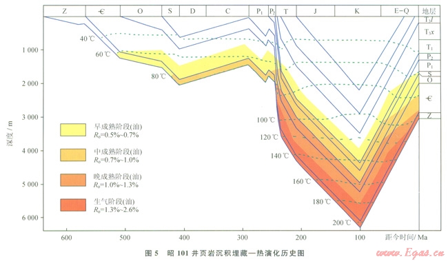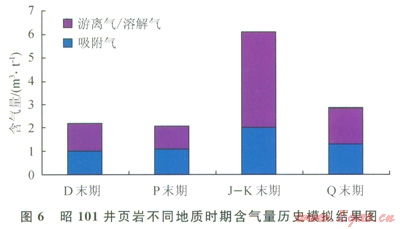 筆者以昭101井、l03等井為例開展了歷史模擬和流體包裹體分析,證實了斷裂對氣藏起強烈破壞這一判斷。昭通除靠近四川盆地的小部分區(qū)域外,多數鉆井都不成功,含氣量低(0.05~0.50m3/t)。昭通與蜀南相鄰,應該大致經歷了相似的演化歷程(圖5),含氣性差別大。昭101井位于芒部背斜,地表斷裂發(fā)育。目的層筇竹寺組因斷裂出現(xiàn)地層重復,頁巖裂隙發(fā)育、方解石充填嚴重,含氣量的現(xiàn)場分析結果不足0.1m3/t,評價為極低含氣量,基本全部逸散。開展的昭101井熱演化歷史和含氣量歷史模擬研究表明:昭通地區(qū)J-K末期含氣量最大,如果穩(wěn)定抬升頁巖將出現(xiàn)超壓,含氣量應該至少介于3~5m3/t,但是目前小于0.1m3/t(圖6)。