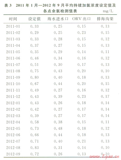 2009年1月至2012年9月,接收站加氯裝置一直連續(xù)運(yùn)轉(zhuǎn),采用單臺設(shè)備運(yùn)行的方式,加氯濃度的設(shè)定同時(shí)考慮ORV承受能力及外排海水余氯環(huán)保要求。期間平均持續(xù)加氯濃度設(shè)定值及各點(diǎn)余氯檢測值見表2、3。