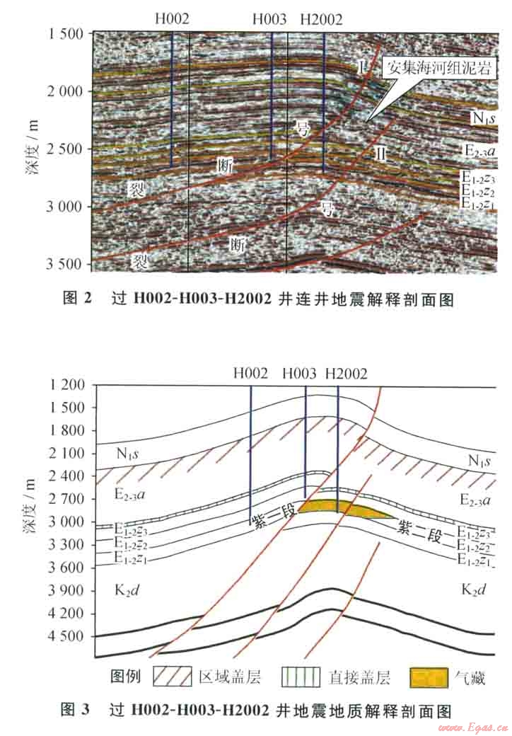 結(jié)合生產(chǎn)動態(tài)資料,斷層兩側(cè)目的層紫二段均有砂體發(fā)育,斷層下盤H2002井在紫二段產(chǎn)氣,在斷層上盤的構(gòu)造高點,新完鉆的評價井H003井海拔明顯高于H2002井,但在紫二段卻未見油氣顯示,試氣結(jié)果為干層,進一步證明了l號斷裂具有較好的側(cè)向密封性。