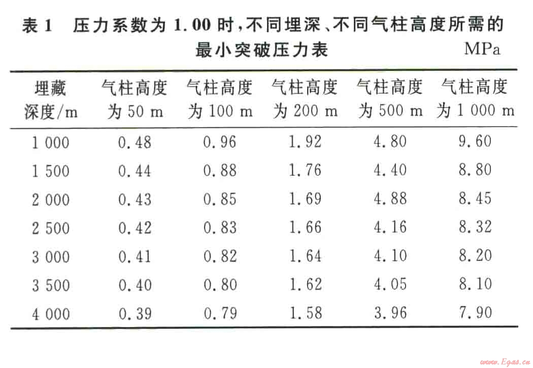 衡量蓋層封閉能力大小的直接標(biāo)志就是在一定地質(zhì)條件下封閉烴柱的高低,其可由突破壓力的大小獲得,同時與氣藏的壓力系數(shù)、埋藏深度也有關(guān)系。該區(qū)壓力系數(shù)為0.96,屬于正常壓力系統(tǒng),因此對應(yīng)的壓力系數(shù)選擇1.00;紫二段埋藏深度介于3500~3650m。根據(jù)不同埋深不同氣柱高度所需的最小突破壓力經(jīng)驗值(表1),3500m埋深封閉200m氣柱高度需要的突破壓力不到2.0mPa,而該區(qū)實驗分析所得上覆泥巖的突破壓力介于2.0~3.0mPa,故可封閉的氣柱高度大于200m,而儲層圈閉的幅度僅為180m,小于可封閉的氣柱高度,因此該區(qū)的泥巖蓋層對儲層是非常有效的,即當(dāng)圈閉完全注滿氣體時,泥巖蓋層也可封閉紫二段儲層。