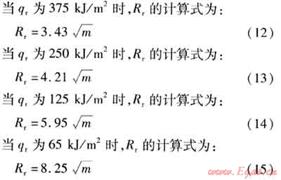 將已知參數(shù)代入式(12)~(15),可計算得到不同火球入射熱輻射劑量下的火球熱輻射半徑(見表4)。