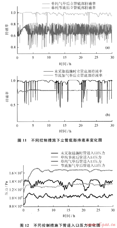 4)從模擬結果看,采取節(jié)流加氣舉法控制段塞流效果比單純節(jié)流或單純氣舉效果都更好,但提高油氣產(chǎn)量的效果不及單純氣舉法。當氣舉氣源不是很充足時,可予以考慮。