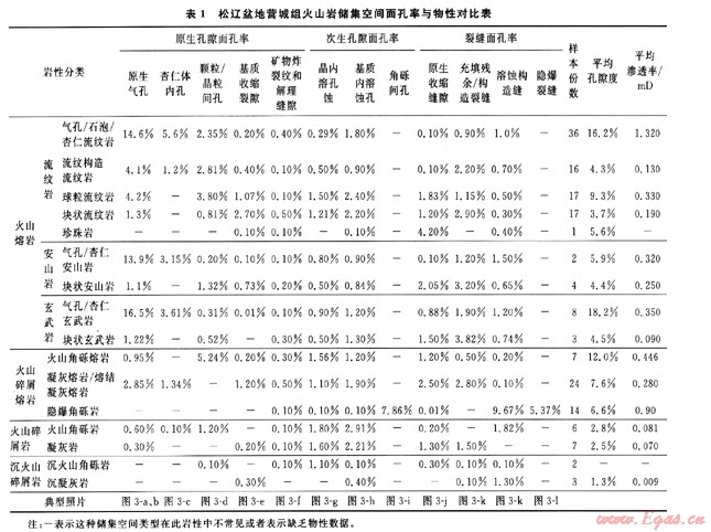 流紋構造形成流紋理間孔(圖3-a),常見,且特點是氣孔成串珠狀分布,可能發(fā)生連通的孔隙,在噴溢相中、上部亞相發(fā)育(圖2),如果此后遭受風化淋濾作用,極易形成風化殼(圖3-m),且該類構造的巖石在平面上延伸較長,所以可形成大面積的儲層。