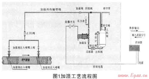 宜春深燃天然氣有限公司自2010年2月開(kāi)始使用溶劑油加濕劑對(duì)天然氣進(jìn)行加濕,溶劑油加濕工藝設(shè)備主要由控制器、儲(chǔ)藥罐、加濕泵、各閥門(mén)組、壓力表及加濕噴嘴等組成,工藝如圖1所示: