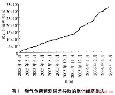 由圖1可知,2005年4月至2006年3月由燃?xì)?/span>負(fù)荷預(yù)測誤差導(dǎo)致的直接經(jīng)濟(jì)損失達(dá)32.3×104元,其中冬半年的經(jīng)濟(jì)損失為19.8×104元,日均損失1310元,大于夏半年的經(jīng)濟(jì)損失12.5×104元和日均損失585元,這與燃?xì)庳?fù)荷水平和預(yù)測的相對誤差有關(guān)。日最大經(jīng)濟(jì)損失來自春節(jié)期間正月初六的欠提氣量,該日欠提氣量占預(yù)訂氣量的17%,損失氣款1.07×104元。