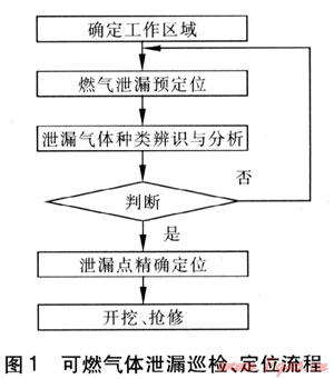 日常的巡檢可采用車載或便攜檢測設備確定工作區(qū)域,如發(fā)現(xiàn)泄漏還需對泄漏氣體進行種類辨識,排除其他氣體(如沼氣)的干擾。對已經確定泄漏的管段可先實施對泄漏點的預定位,由在線檢測或日常巡檢確定泄漏的大致區(qū)域,再進行精確定位,如遇硬質路面或在大片區(qū)域內均檢測到高濃度可燃氣體,需結合路面鉆孔機和吸真空系統(tǒng)打孔定位??扇細怏w泄漏巡檢、定位流程見圖1。