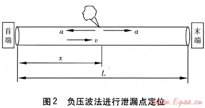 在管道首末兩端安裝壓力傳感器,并由SCADA系統(tǒng)記錄傳感器傳送的數(shù)值。當(dāng)泄漏發(fā)生時,會在管道內(nèi)產(chǎn)生負壓波動,從泄漏點向上、下游傳播,并以指數(shù)規(guī)律衰減,這種壓力波動和正常壓力波動大不相同,具有幾乎垂直的前緣。首末兩端的壓力傳感器分別在不同時刻捕捉到負壓波信號,從而判斷管道發(fā)生了泄漏,根據(jù)負壓波傳到管道兩端的時間差和負壓波波速可以進行泄漏點定位[8]。