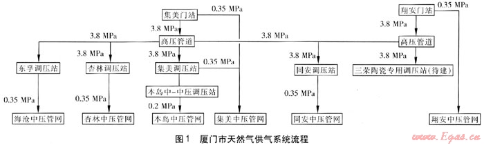 廈門市液化天然氣利用工程于2008年1月全面開工建設(shè),是福建省LNG工程總體項目的9個子項目之一。2010年建設(shè)規(guī)模為年供氣1.5568×108m3/a,最大供氣量為53.4×104m3/d,供應(yīng)居民用戶約30.9×104戶。該工程主要分為兩部分:a.天然氣高中壓輸配系統(tǒng)。建設(shè)門站2座(集美門站、翔安門站)、高-中壓調(diào)壓站4座(東孚調(diào)壓站、杏林調(diào)壓站、集美調(diào)壓站、同安調(diào)壓站)和中-中壓調(diào)壓站1座(本島調(diào)壓站);敷設(shè)高壓輸氣管道27.78km,中壓輸氣管道12.22km,中壓輸配管道488.45km。工程總造價達6.28×108元。b.置換和發(fā)展天然氣用戶62×104戶。廈門市天然氣供氣系統(tǒng)流程見圖1。
