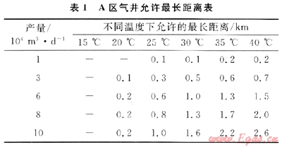 1) A區(qū)氣井的天然氣不伴熱直接進站,不加熱直接脫水,可以取消采氣管道伴熱和站內加熱工藝。不同產(chǎn)氣量和井口溫度允許采氣管道距離不同,其允許最長距離見表1。