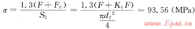 式中F0為螺栓殘余鎖緊力,F(xiàn)0=K0F,N;K0為殘余鎖緊系數(shù),《機(jī)械設(shè)計基礎(chǔ)》建議K0為1.5~1.8,取K0=1.8;S2為螺栓螺紋小徑處橫截面積,mm2;d2為螺栓螺紋小徑,取d2=mm。