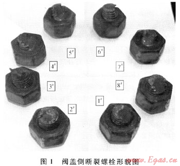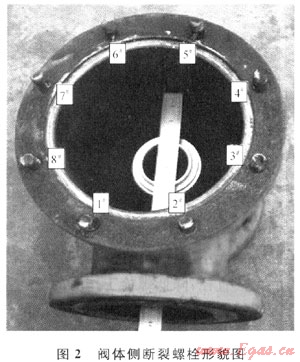 閥蓋上的8個螺栓光孔均發(fā)生了月牙形磨損或擠壓變形成為橢圓形,其中橢圓長軸沿徑中心。對光孔長軸和短軸進(jìn)行測量并計算橢圓度,發(fā)現(xiàn)1#、2#、3#、8#光孔比4#、5#、6#、7#光孔橢圓度大(光孔編號與螺栓編號一一對應(yīng))。