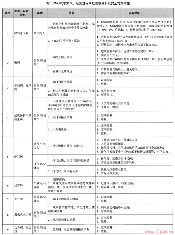 2.6 CNG汽車加氣、運(yùn)營過程中危險(xiǎn)性分析見表1。