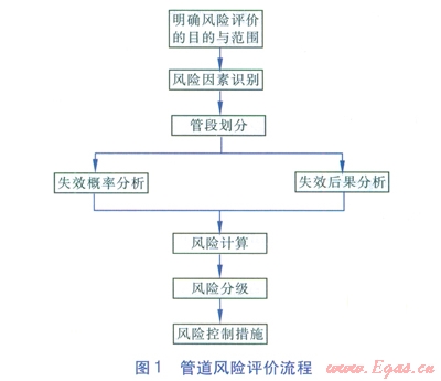 風險評價是指識別出對管道安全運行產(chǎn)生不利影響的風險因素,評價事故發(fā)生的可能性和后果,綜合得到管道風險大小,并提出相應風險控制措施的分析過程[6]。風險評價是完整性管理的關鍵環(huán)節(jié),應根據(jù)評價范圍、復雜程度采用不同的方法和技術。管道風險評價流程見圖l,其中的幾個主要環(huán)節(jié)一般為風險因素識別、失效概率分析、失效后果分析和風險分級。