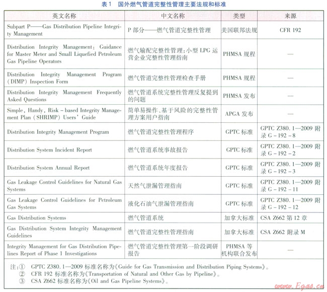 燃氣管道完整性管理法規(guī)和標準是實施管道完整性管理的重要指導性文件。為了有效推進燃氣管道完整性管理工作,美國、加拿大等國家燃氣管理和研究機構制定了相關的法規(guī)和標準,主要的法規(guī)和標準見表l。表l中APGA是美國公共燃氣協(xié)會的簡稱,GPTC是美國燃氣協(xié)會(簡稱AGA)的下屬機構燃氣管道技術委員會的簡稱。