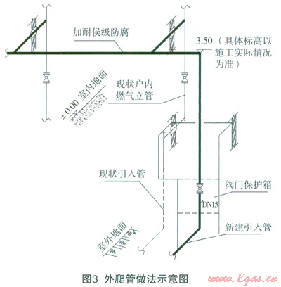 針對老舊小區(qū),戶內(nèi)立管往往位于居民室內(nèi)裝修或者包封內(nèi),改造難度較大或者不存在改造的可能性,可采用將引入管改至與首層立管相接處的方式,而不改造原有燃?xì)饬⒐堋H绻嬖诘厣弦肟诒徽級旱那闆r,而且占壓物不便于拆除時,可采用樓前管采用外爬墻方式敷設(shè),外爬管在樓房燃?xì)饬⒐芩趥?cè)爬至二層樓的0.5m高處,分別與現(xiàn)狀燃?xì)饬⒐芟嘟?,如圖3所示。