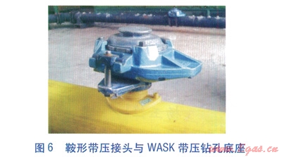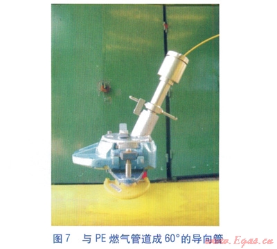 改進(jìn)后的CCTV檢查系統(tǒng)借鑒了PE燃?xì)夤艿缼翰煌膺B接技術(shù)[2],采用內(nèi)直徑較大的鞍形帶壓接頭(見圖6)、WASK帶壓鉆孔底座(見圖6)、與PE燃?xì)夤艿莱?span lang="EN-US">60°的導(dǎo)向管(見圖7),可允許直徑為24、35、50mm的攝像頭按設(shè)定方向順利進(jìn)入PE燃?xì)夤艿纼?nèi)。由于采用了大規(guī)格攝像頭,電纜線的直徑由4.5mm增至7.4mm,解決了攝像頭無法順利通過90°電熔彎頭的問題。