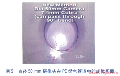 因此,傳統(tǒng)CCTV檢查系統(tǒng)用于PE燃?xì)夤艿纼?nèi)檢測時(shí),只能針對(duì)含大于90。彎頭的管段或直管段。相對(duì)于較大規(guī)格的攝像頭,直徑為24mm的攝像頭亮度及可視范圍也明顯較弱。直徑分別為24、50mm的攝像頭在PE燃?xì)夤艿乐械某上癞嬅娣謩e見圖4、5。