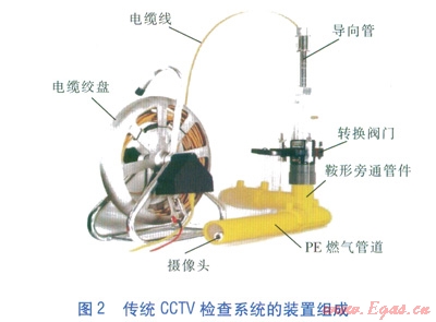 傳統(tǒng)CCTV檢查系統(tǒng)的裝置組成見圖2。經(jīng)導(dǎo)向管、轉(zhuǎn)換閥門、鞍形旁通管件后攝像頭進(jìn)入PE燃?xì)夤艿纼?nèi),攝像頭的前進(jìn)動(dòng)力來自電纜線。電纜線內(nèi)置電源線、影像信號(hào)線、接地線:電源線為攝像頭(包括照明裝置)供電,信號(hào)線把影像傳回顯示器并儲(chǔ)存在儲(chǔ)存器上,接地線為防止攝像頭移動(dòng)過程中出現(xiàn)放電現(xiàn)象。攝像頭、電纜線均采用防水、防爆設(shè)計(jì),既不會(huì)因觸水而損毀,也不會(huì)引起燃?xì)獗肌?span lang="EN-US">
