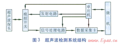 超聲波的檢測系統(tǒng)結(jié)構(gòu)見圖3,超聲波檢測系統(tǒng)主要以單片機(jī)為控制核心,數(shù)據(jù)的采集、處理、顯示由微機(jī)完成。單片機(jī)控制發(fā)射電路發(fā)出窄脈沖,激勵(lì)超聲波探頭發(fā)出超聲波,并隨之切換開關(guān),切換到接收回路。然后啟動(dòng)數(shù)據(jù)采集卡進(jìn)行數(shù)據(jù)采集,經(jīng)過微機(jī)處理后顯示分析結(jié)果。超聲波檢測技術(shù)測量精度高,能分辨管內(nèi)壁和外壁腐蝕,不受管材約束,能夠測量漸變腐蝕。但該檢測技術(shù)存在檢測盲區(qū),且只能對光潔表面檢測,還需要耦合劑。