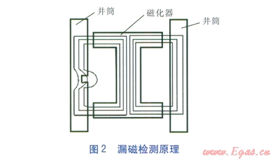 漏磁檢測系統(tǒng)由電源、磁化裝置、檢測探頭、A/D模塊、計(jì)算機(jī)等組成。井筒壁被磁化裝置磁化后發(fā)出電磁信號(hào),該信號(hào)被檢測探頭檢出,再由A/D模塊采集,最后在計(jì)算機(jī)中顯示分析結(jié)果。該檢測技術(shù)對突變?nèi)毕菝舾?,無檢測盲區(qū),能對管壁進(jìn)行全面檢測,對表面光潔度要求低,不需要耦合劑。缺點(diǎn)是測量精度低,受管材限制,不能夠測量漸變腐蝕。