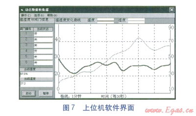 上位機可以方便地實現(xiàn)與單片機之間的交互,實現(xiàn)操作可視化,更加直觀,便于實現(xiàn)保存數(shù)據(jù)等功能。上位機軟件采用Visual Basic 6.0編寫。上位機軟件界面見圖7。在上位機的邏輯處理中,可以參照不同的要求,對溫濕度的處理時間步長進行人為設(shè)定。步長越小,調(diào)控越精密,越準(zhǔn)確。反之,步長越大,調(diào)控較為粗略,但仍可以在人體的舒適范圍內(nèi)。