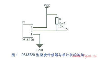 DSl8820型溫度傳感器是由美國DALLAS公司生產(chǎn)的單總線數(shù)字式智能溫度傳感器,測溫范圍為-55~125℃,具有獨特單總線(地址線、數(shù)據(jù)線、控制線合為一條信號線)接口方式,僅需要一根信號線就可以與STC89C52型單片機連接,實現(xiàn)雙向通信。DSl8820型溫度傳感器與單片機的連接見圖4。引腳1為地線接口,引腳2為數(shù)據(jù)通信線接口,引腳3為5 V電源線接口。