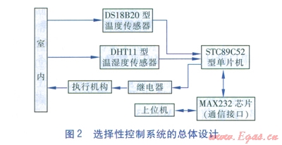 選擇性控制系統(tǒng)的設(shè)計思路是在優(yōu)先保證室內(nèi)溫度達(dá)到預(yù)設(shè)值的前提下,調(diào)節(jié)室內(nèi)空氣相對濕度以最大限度地降低空調(diào)系統(tǒng)能耗。溫濕度傳感器實時測量室內(nèi)空氣的溫濕度,并通過串行接口將溫濕度信號傳至單片機,單片機將接收到的溫濕度信號與內(nèi)部預(yù)置及計算的溫濕度范圍進行比較判定,并將實時溫濕度信號通過通信接口上傳至上位機顯示。在單片機比較判定結(jié)束后,將控制信號傳遞給繼電器,繼電器通過控制執(zhí)行機構(gòu)在優(yōu)先滿足室內(nèi)溫度需要的前提下,進行室內(nèi)空氣相對濕度調(diào)節(jié)[4]。選擇性控制系統(tǒng)的總體設(shè)計見圖2。