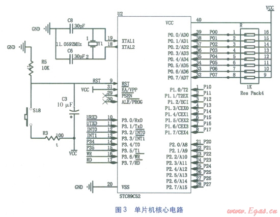 STC89C52型單片機是由STC公司生產(chǎn)的一種低功耗、高性能產(chǎn)品。采用ATMEL高密度非易失儲存器技術(shù)制造,與工業(yè)標(biāo)準(zhǔn)的MCS-51指令集和輸出引腳兼容。單片機核心電路見圖3。主要引腳功能:XTALl、XTAL2引腳為晶振接口,RST引腳為上電復(fù)位接口,P0系列引腳為上拉電阻接口,P21引腳為DHTll型溫濕度傳感器接口,P22引腳為DSl8820型溫度傳感器接口,URXD、UTXD引腳為與上位機的通信接口,其他引腳為備用。