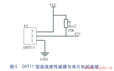 DHTll型溫濕度傳感器(由于其測溫范圍較窄,精度欠佳,因此選擇性控制系統(tǒng)只利用其測相對濕度功能)是一款含有已校準(zhǔn)數(shù)字信號輸出的單總線制溫濕度傳感器。DHTl l型溫濕度傳感器包括1個電阻式感濕元件、1個NTC測溫元件[5]。測量范圍:相對濕度20%~90%,溫度0~50℃。DHTll型溫濕度傳感器與單片機的連接見圖5。引腳1為地線接口,引腳2為數(shù)據(jù)通信線接口,引腳3為電源線接口。