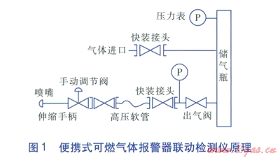 便攜式可燃?xì)怏w報(bào)警器聯(lián)動檢測儀是一種用于檢測可燃?xì)怏w報(bào)警器工作狀態(tài)的裝置,它可以用指定濃度的可燃?xì)怏w(以下簡稱標(biāo)準(zhǔn)氣體)對報(bào)警器進(jìn)行檢測,這樣既能夠測試報(bào)警器的工作狀態(tài)是否正常,同時(shí)還不對傳感器等靈敏部件造成損壞,其原理見圖l。