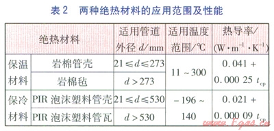 在充分比較各種絕熱材料性能后,結(jié)合表l給出的操作溫度范圍,保溫材料選用巖棉,保冷材料選用聚異氰脲酸酯(Polyisocyanurate Foam,PIR)泡沫塑料,兩種絕熱材料的應(yīng)用范圍及性能見表2,表中tcp為界面間平均溫度,單位為℃。
