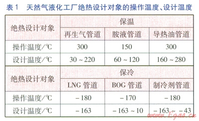 在天然氣液化工廠絕熱設(shè)計(jì)中,一般考慮對再生氣、胺液、導(dǎo)熱油等管道進(jìn)行保溫,對LNG管道、BOG管道、制冷劑管道進(jìn)行保冷。天然氣液化工廠絕熱設(shè)計(jì)對象的操作溫度、設(shè)計(jì)溫度見表l。