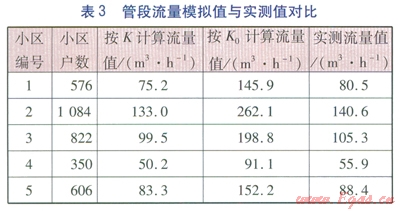 為了驗(yàn)證計(jì)算得到的同時(shí)工作系數(shù)的準(zhǔn)確性,下面分別利用同時(shí)工作系數(shù)K與K計(jì)算該地區(qū)5個(gè)小區(qū)的管段流量,并將結(jié)果與實(shí)測(cè)流量值進(jìn)行對(duì)比,見表3。