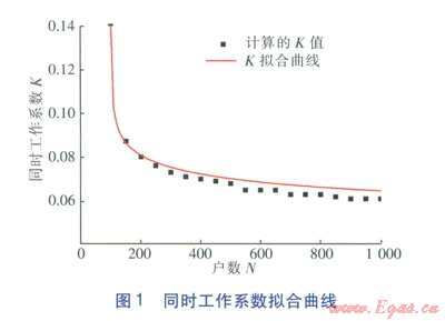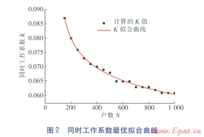 此式仍然滿足同時(shí)工作系數(shù)的一般規(guī)律,而且加冪運(yùn)算使得K隨Ⅳ的變化而變化的敏感性提高。當(dāng)置信區(qū)間P較小時(shí),計(jì)算誤差對(duì)整個(gè)運(yùn)算的影響逐漸減小,故而造成的波動(dòng)也越來越小。針對(duì)此地區(qū)的同時(shí)工作系數(shù)在置信區(qū)間P=[0.99,1)時(shí),將計(jì)算出來的離散數(shù)據(jù)擬合成曲線的函數(shù)關(guān)系,將表1中的數(shù)據(jù)作為依據(jù)進(jìn)行擬合,得到戶數(shù)與同時(shí)工作系數(shù)的擬合結(jié)果,見圖1。