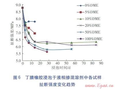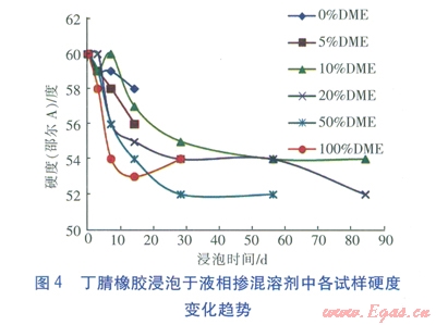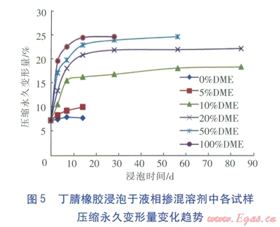 ③丁腈橡膠是一種合成橡膠,屬交聯(lián)聚合物,它在二甲醚摻混液中的溶脹都屬于有限溶脹。液相摻混液對丁腈橡膠的腐蝕,主要發(fā)生在浸泡的前10d左右的時間里,之后溶脹現(xiàn)象都趨于平穩(wěn)。
